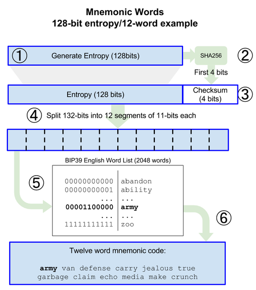 5. 각 각의 11비트를 2048(2^11)개의 미리 정의된 단어로 치환한다.