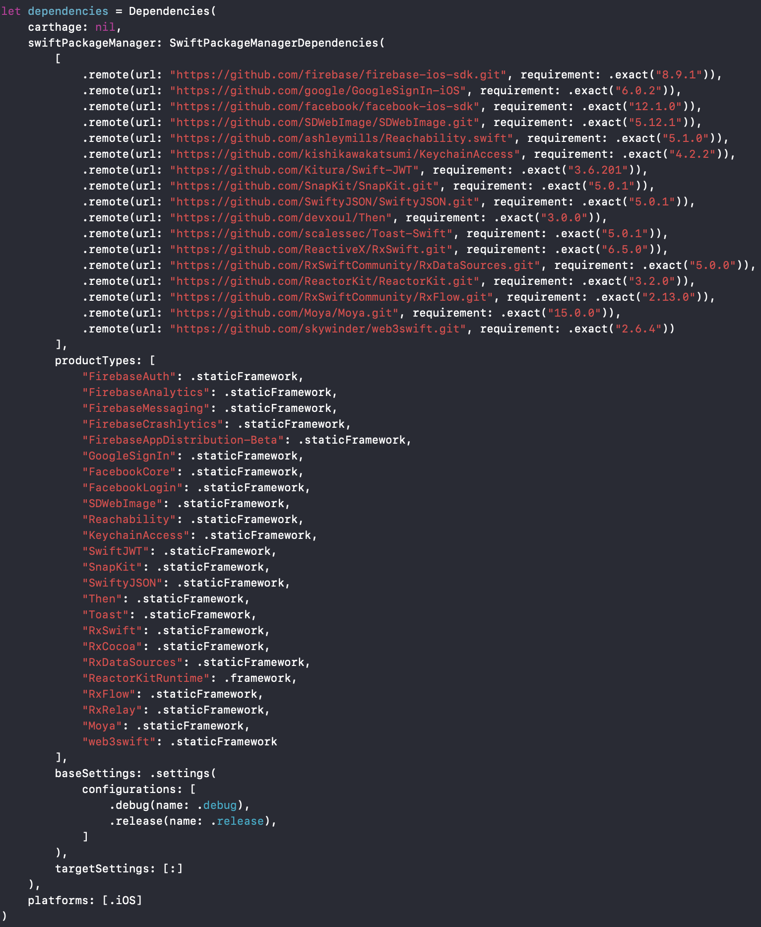 let dependencies = Dependencies(carthage: [], swiftPackageManager: [], platforms: [])