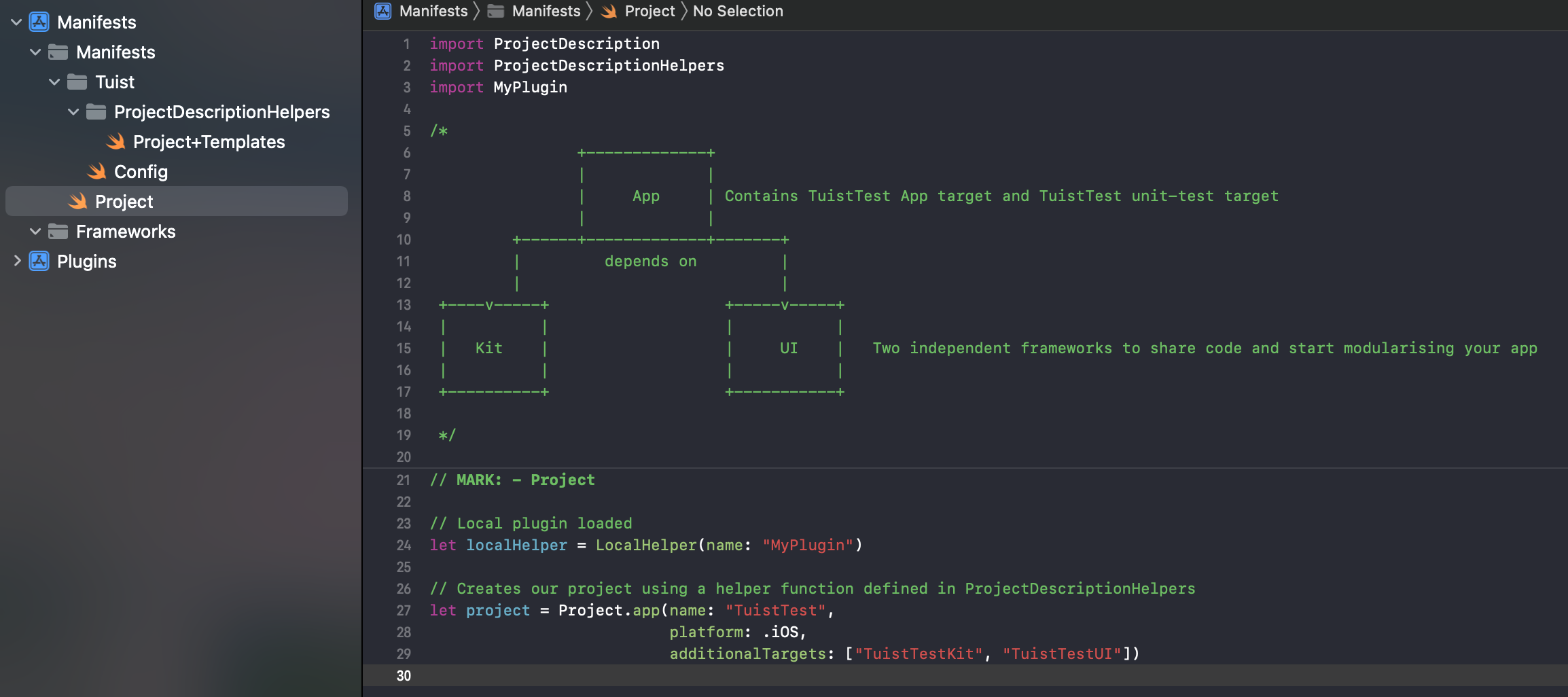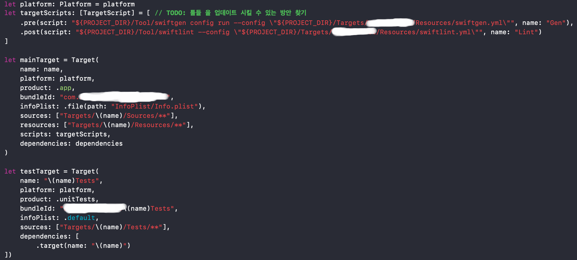 Project.swift를 생성해 프로젝트를 수정해보자. 아래 명령어를 실행시키면 Project.swift가 생성(없을 때)되고, XCode가 실행된다.