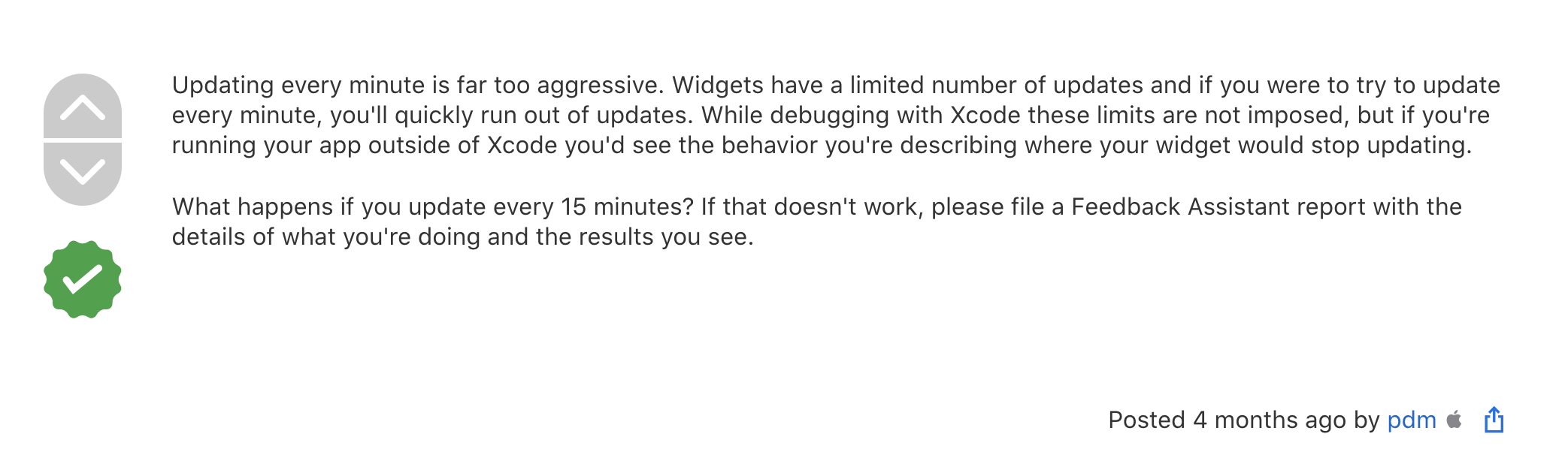 그리고 더 찾아본 결과로는 위젯의 갱신횟수에는 하루마다 제한하는 횟수가 있으며, 시뮬레이터에서는 그 제한하는 횟수가 반영되지않기때문에 실제 디바이스로 테스트를 해야한다고한다.
